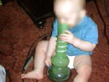 I am not an idiot. I am assuming this girl ( she is 19) thought this picture would be funny. I mean who hasn’t posed their 11 month old with something totally inappropriate, a thong on their head, an empty beer can, a BONG and snapped a photo for posterity. I think we are all guilty of one three a few of these ourselves. I’d say probably not drug paraphernalia. I mean, who has this stuff lying around the house when they have kids? Oh yeah, crack heads, that’s who. I forgot.My bad.